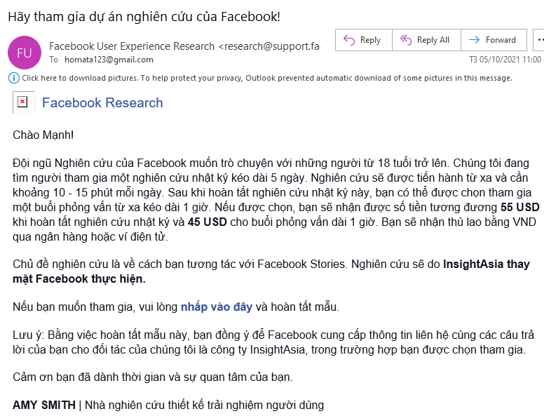 Sáng nay như thường lệ tôi lại vào Outlook để check email học tập và công việc. Một email nằm trên cùng cột Inbox đến từ tài khoản email "Facebook User Exprience Research-<[email protected] com> " thu hút sự chú ý của tôi. Tiêu đề của mail này là lời kêu gọi "Hãy tham gia dự án nghiên cứu của Facebook!". Về phần nội dung đại khái rằng nếu bạn đủ 18 tuổi trở lên và dùng Facebook thì bạn có thể tham gia vào một khảo sát nghiên cứu trong 5 ngày,mỗi ngày từ 10-15 phút, kết thúc khảo sát bạn còn có quyền chọn tham gia cuộc phỏng vấn từ xa. Sau cùng bạn sẽ được nhận tổng cộng 45+55=100 USD, sẽ được quy đổi ra VND khi chuyển cho bạn qua ví điện tử hoặc tài khoản ngân hàng. Đánh giá qua email này sẽ thấy tài khoản email có địa chỉ khá "uy tín" đủ để người nhận tin rằng nó đến từ một bộ phận nghiên cứu nào đó tại Facebook,nhiệm vụ đặt ra cũng rất dễ dàng và món thù lao lại quá hời!