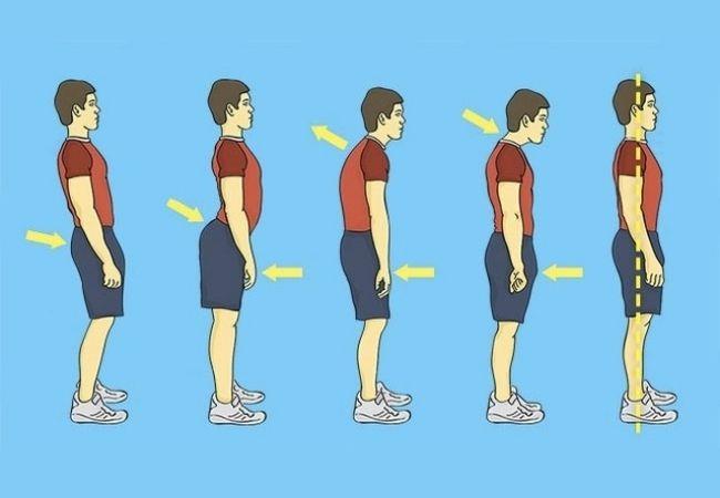 +) Tư thế đứng: Bạn dùng tay để cảm nhận phần lưng như lúc ngồi. Phải cố rèn sao cho thẳng. Dùng tay cảm nhận phần phía trước bằng cách xoa nhẹ từ bụng trở xuống. Để bụng hơi hóp lại, TUYỆT ĐỐI KHÔNG ĐƯỢC ƯỠN BỤNG để tránh bị võng mông. Mở ngực, hai vai mở rộng ra Cằm và cổ thẳng. Mắt nhìn thẳng. Nên tập thói quen không dùng điện thoại khi đứng vì cổ cúi xuống liên tục sẽ dẫn đến đau xương khớp, đau mỏi vai gáy, vôi hóa, thoái hóa cột sống cổ.
