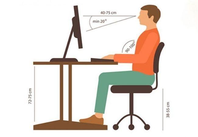 Lưng thẳng, bạn có thể đưa tay ra sau lưng và vuốt nhẹ để kiểm tra xem phần lưng có thẳng không. Khi vuốt từ phần sống lưng đến hông mà thấy một đường thẳng là lưng đã thẳng, nếu không thì phải chỉnh lại. Hơi hóp bụng lại. Tốt nhất là bạn nên tập thở bằng bụng để giúp cho phần bụng, thắt lưng chịu lực tốt hơn. Cổ thẳng, ngồi làm sao để cằm không phải hạ là tốt nhất. Nên cố gắng để có thể nhìn vật ở ngang tầm mắt, như thế áp lực lên cổ sẽ đỡ hơn. Mắt cách vật 35~40 cm. Hai chân để rộng bằng vai, và hai chân cần chạm được xuống đất. TUYỆT ĐỐI TRÁNH BẮT CHÉO CHÂN (động tác bắt chéo chân sẽ làm bạn dễ mắc các bệnh cột sống cũng như khiến phần xương háng bị thô), hoặc chân đung đưa. Khi ngồi tầm 45~60 phút, bạn cần đứng dậy thư giãn gân cốt. Nếu bạn phải làm việc với thiết bị điện tử thì cũng cách tầm khoảng thời gian đó là nhỏ mắt một lần cho mắt đỡ bị khô. Bạn có thể sử dụng thêm DẦU DỪA để nhỏ mắt giúp bảo vệ thị lực.